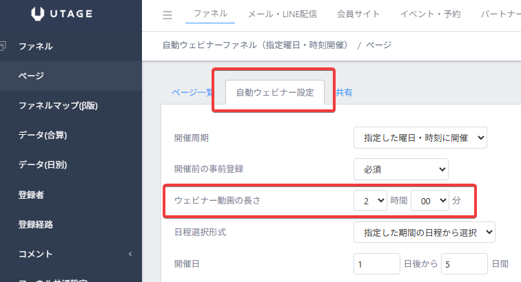 該当ファネルの「自動ウェビナー設定」で設定されている「ウェビナー動画の長さ」と