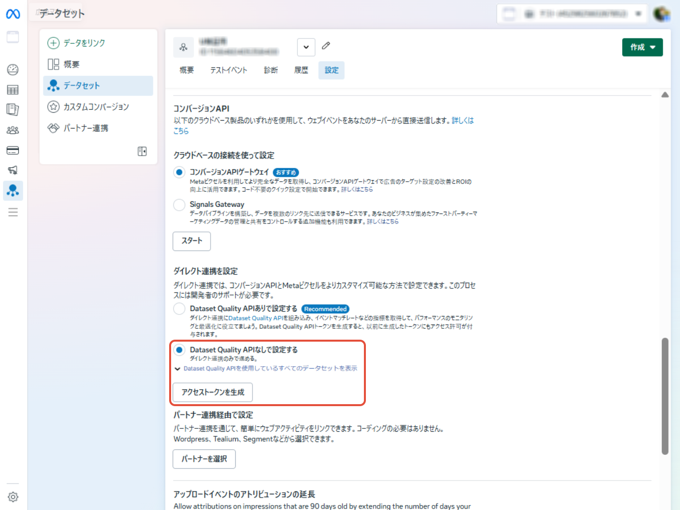 データセット選択>設定>アクセストークンを生成