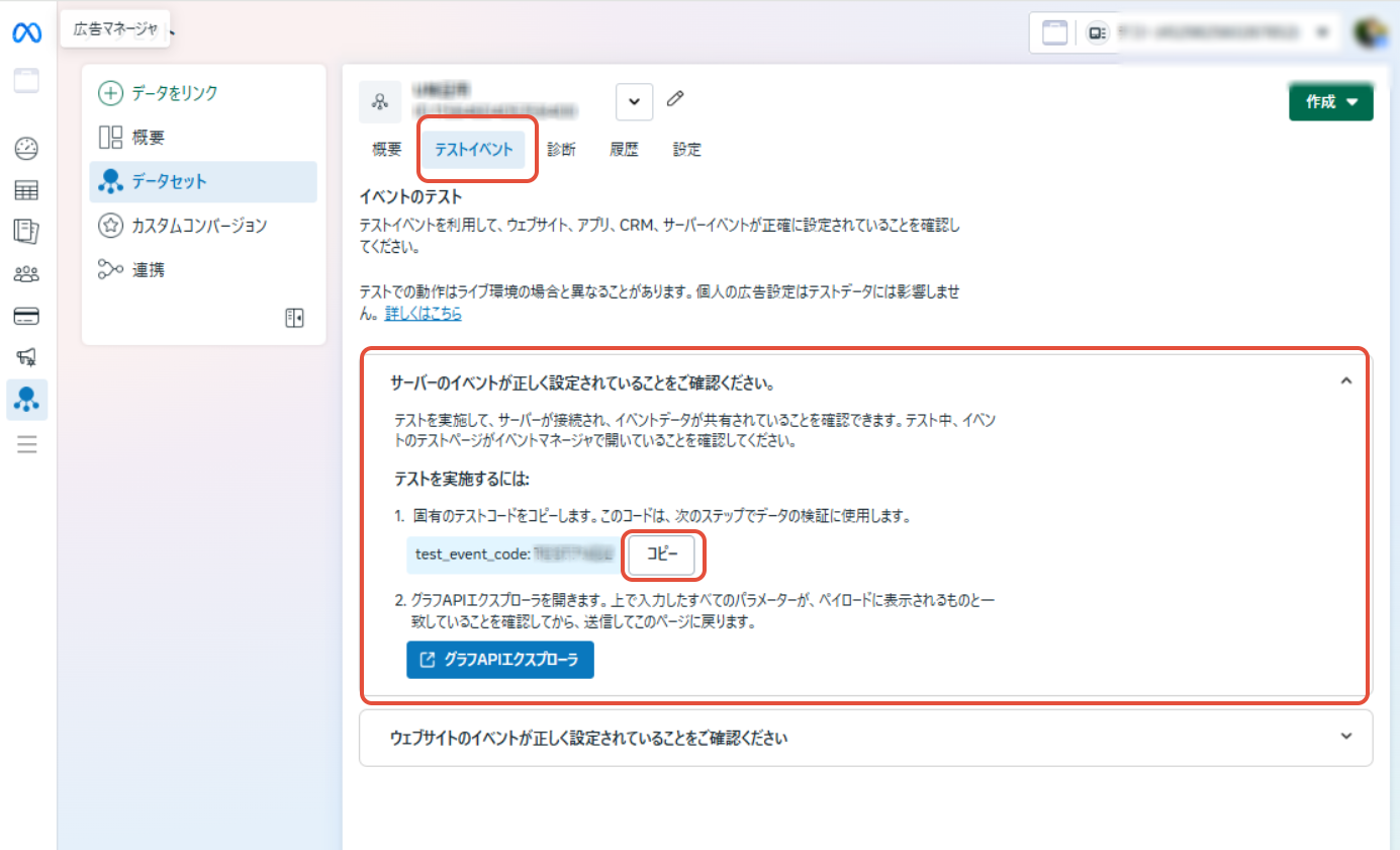 ファネル > 広告連携設定 > 広告連携設定を選択 > テストを行い、