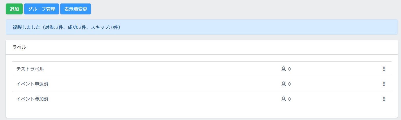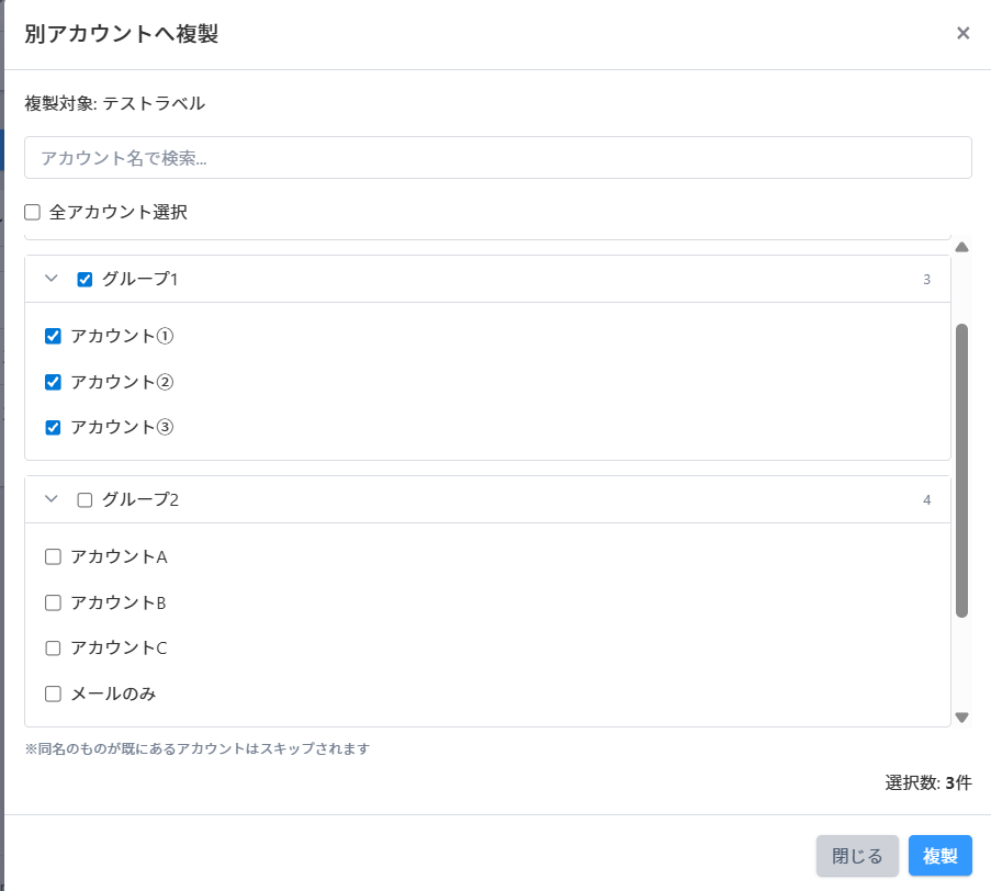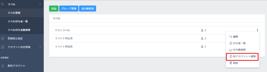 各ラベルの操作メニュー【︙】より、ラベルを「別アカウントへ複製」することができます。