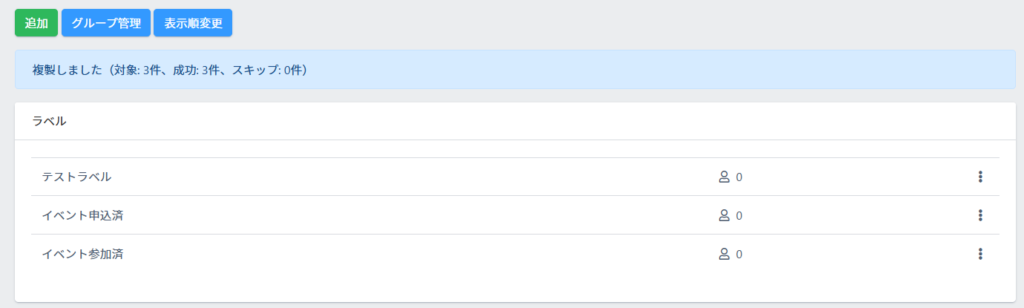 5.ラベル管理に戻ると作成したグループが追加されています。グループに追加する場合は【表示順変更】でグループ分けしてください。
