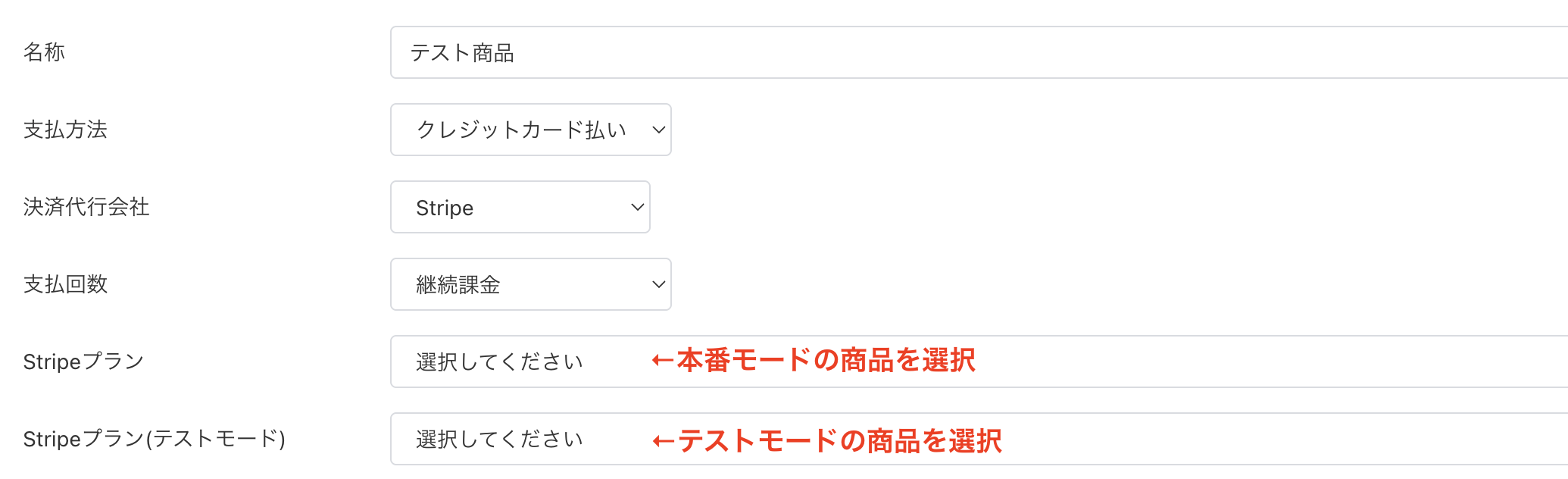 原因④:「Stripeプラン(テストモード)」が選択されていない