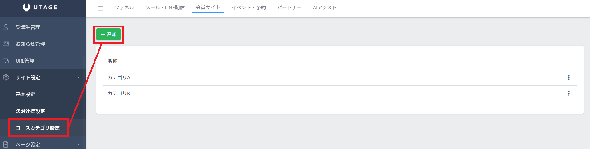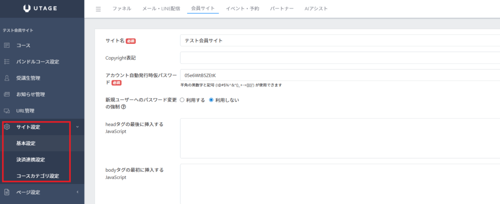 会員サイトのサイト設定(基本設定/決済連携設定/コースカテゴリ設定)について説明します。