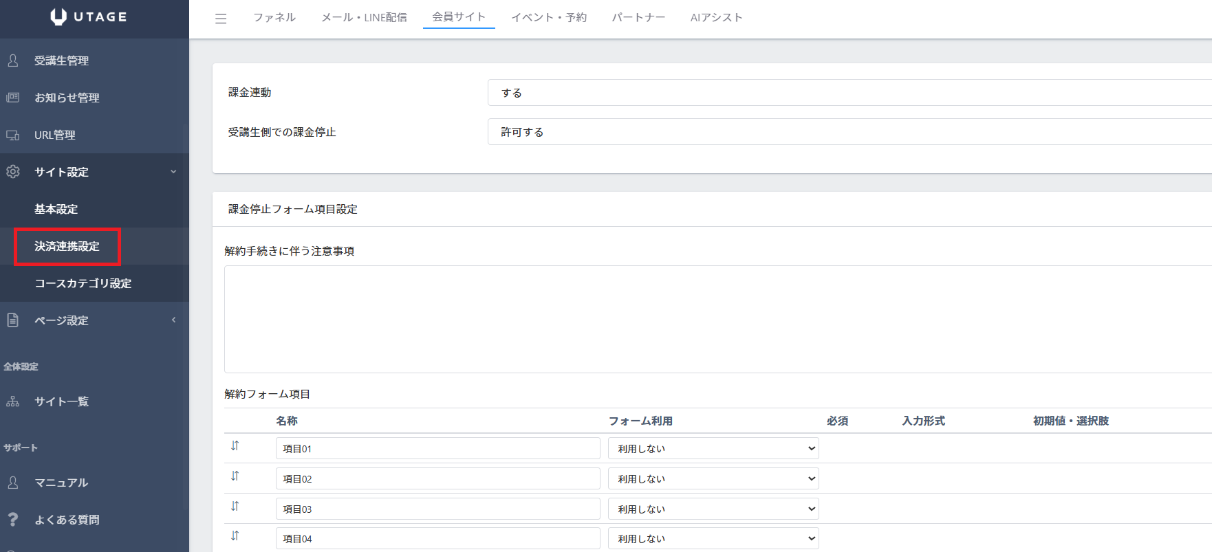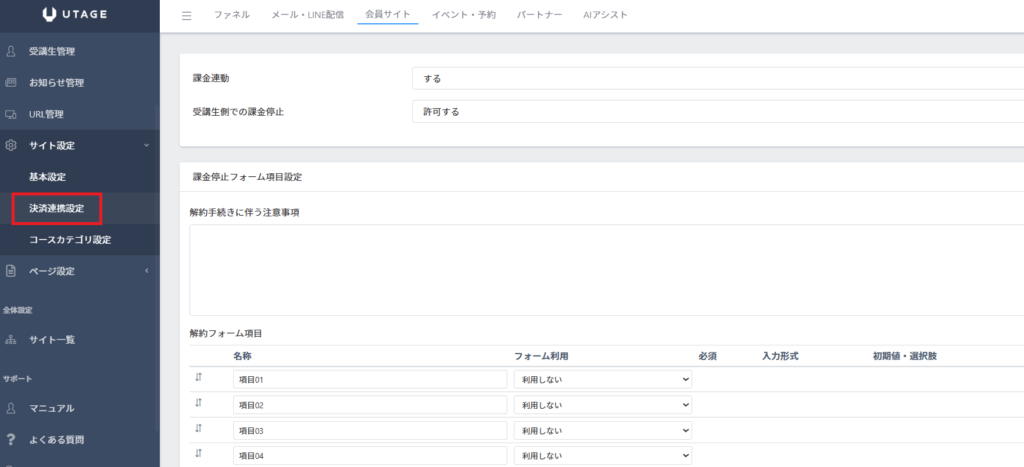 受講生側で解約やクレジットカード情報の変更ができるようにする設定です。