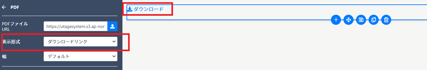 メディア管理にアップロードしたPDFのURLが指定できます。