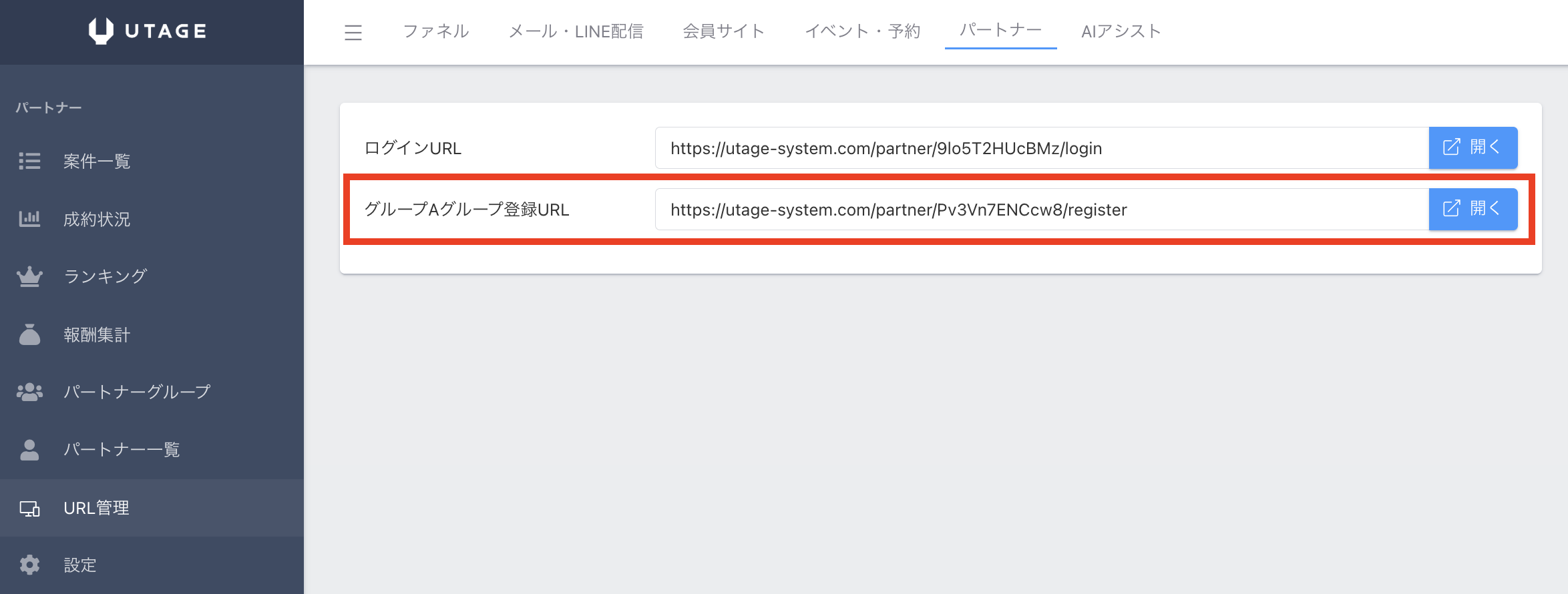 作成したパートナーグループの登録URLが「URL管理」に表示されます。
