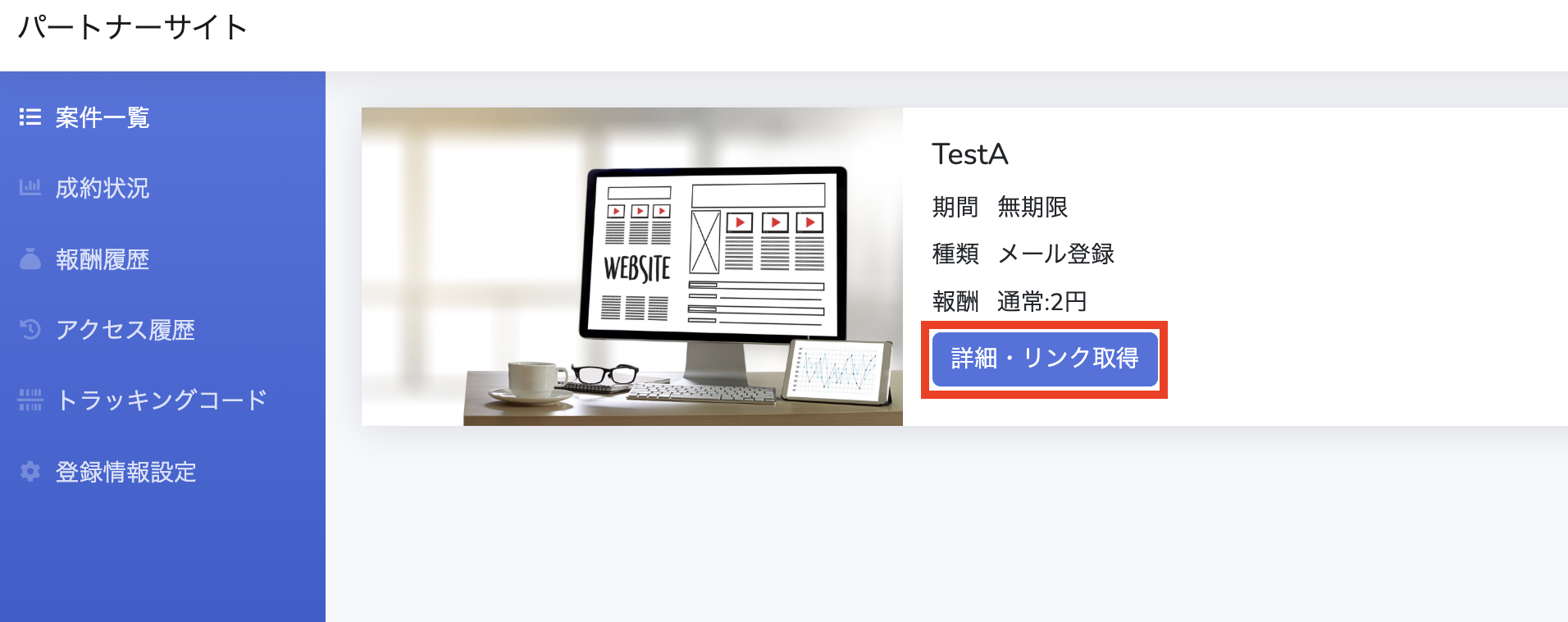 パートナーサイトの左メニュー「案件一覧」から該当案件の「詳細・リンク取得」ボタンをクリックします。
