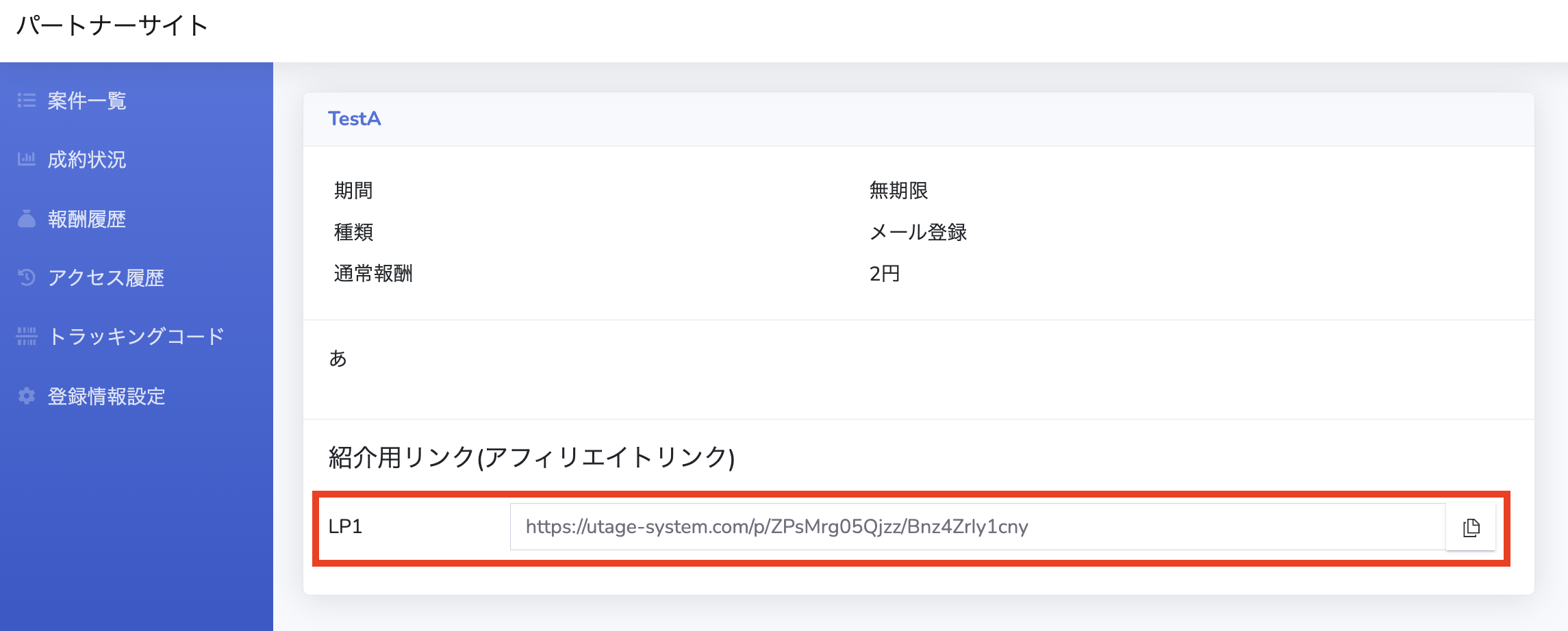 ※UTAGE管理画面上では紹介用リンク(アフィリエイトリンク)を取得できません。