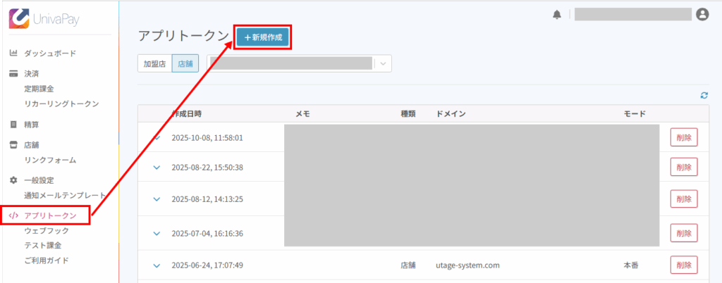 UnivaPay管理画面 > アプリトークン > 【+新規作成】ボタン押下
