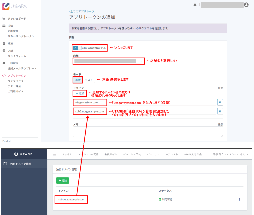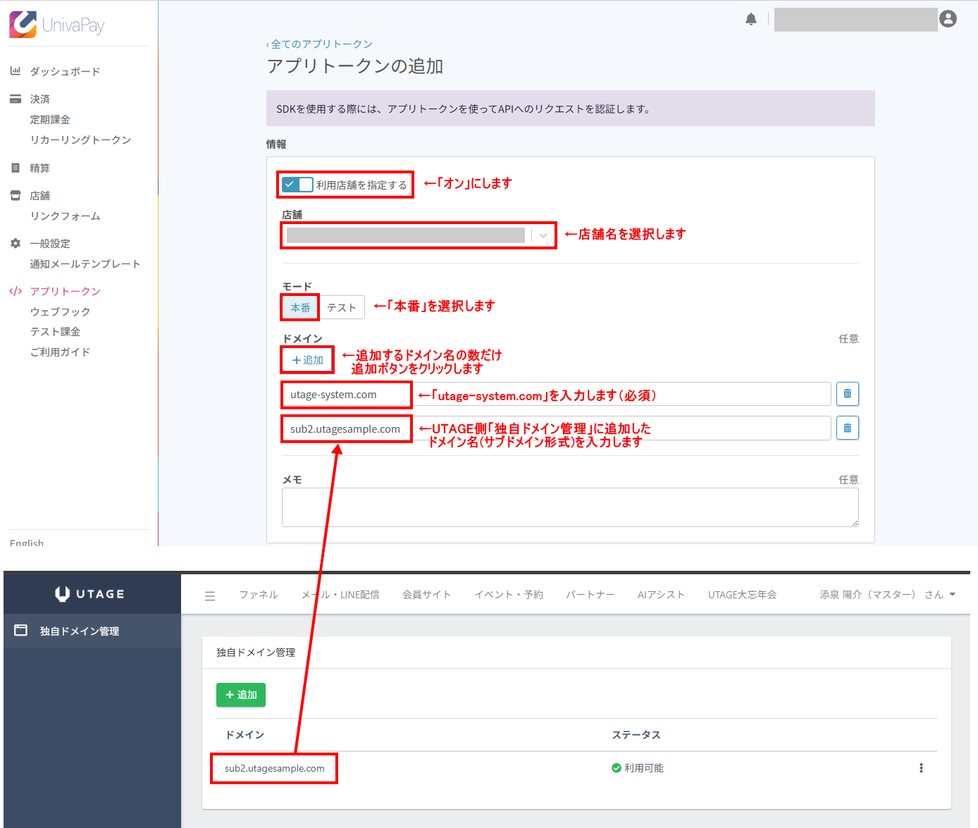 (UnivaPay決済連携設定完了後にUTAGE「独自ドメイン管理」にドメイン名を追加したケース)