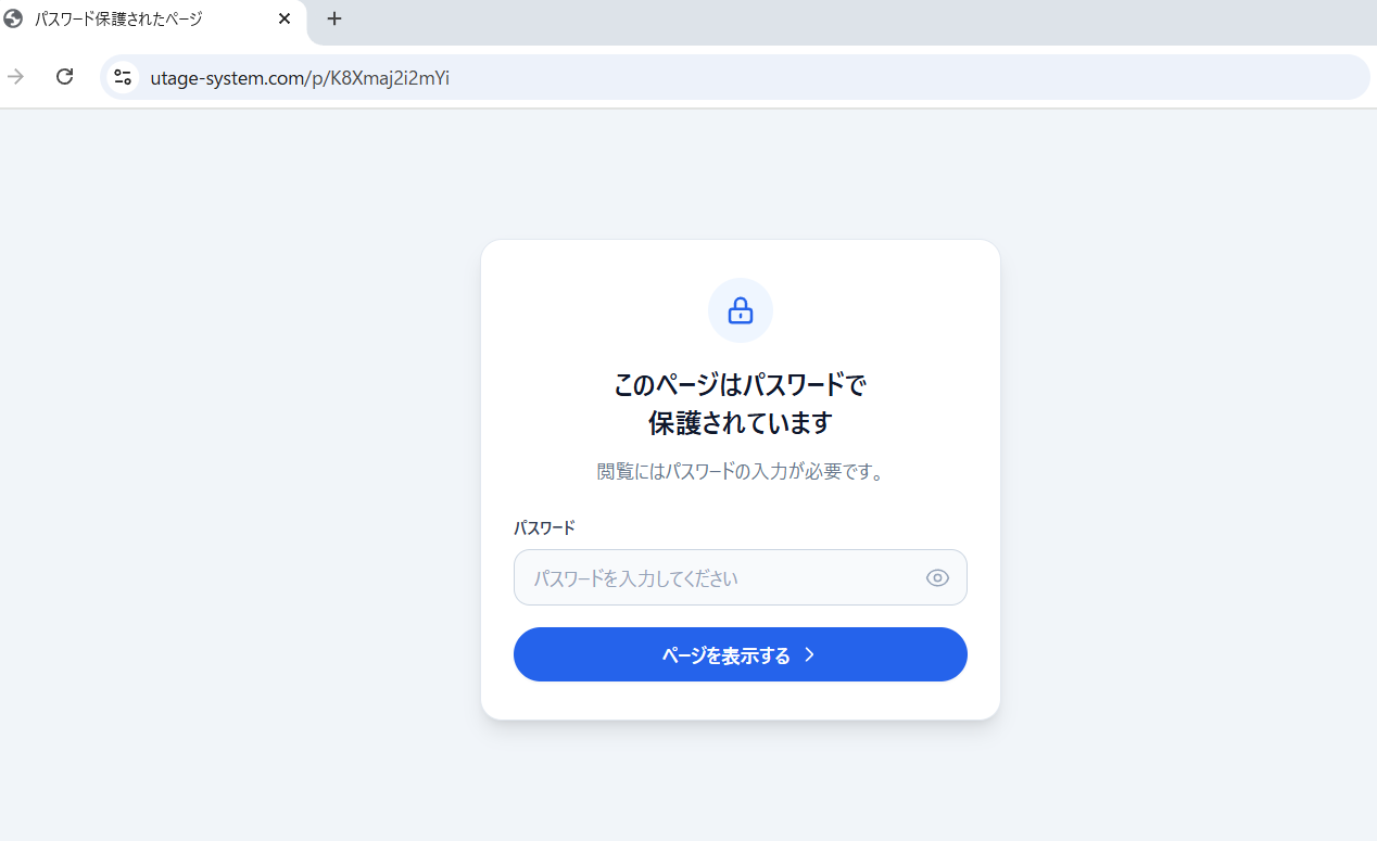 ファネルのパスワード保護 ページ単位で閲覧パスワードの設定が可能です。 任意のユーザーのみ閲覧可能にしたい場合などでご活用ください。 設定方法 1、ファネル > 該当ファネル > パスワードを設定したいページの編集画面を開く 2、ページ設定 > パスワード保護 3、「パスワード保護を利用する」を選択し、任意のパスワードを設定して「保存」 ↓ 実際のページの表示 ※セッションが切れた場合(何も操作のない状態で約2時間)、再度パスワードの入力が求められます。 関連記事 【イベント・予約】担当者設定のZoom連携時、UTAGEログイン画面へ遷移してしまいZoom連携ができない 【個別相談・個別予約】担当者のプロフィールを設定したい 会員サイトで、レッスン編集画面から「プレビュー」ボタンのクリック時、またはレッスン編集画面の「コンテンツ」欄に「404」エラー画面が表示されてしまう UTAGE月額料金の課金サイクルについて(初回課金日が29日/30日/31日の場合) 【UnivaPay】フロント商品+オーダーバンプ商品の決済において、オーダーバンプ商品のみが決済失敗となっている 【UnivaPay】UnivaPay管理画面>決済にてステータス:失敗「336:お支払い方法の取引制限を超えています」が表示 Comments are closed.