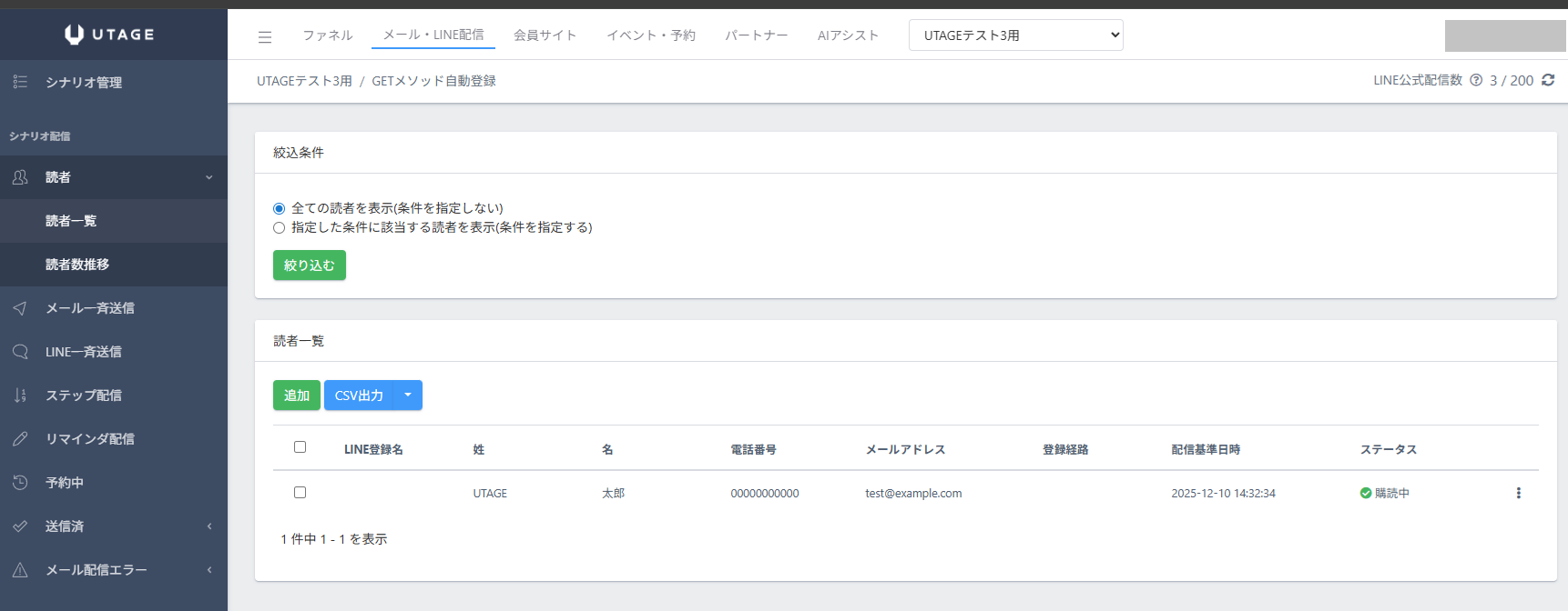 ・UTAGE側にデータ登録(シナリオ読者登録)がされているか