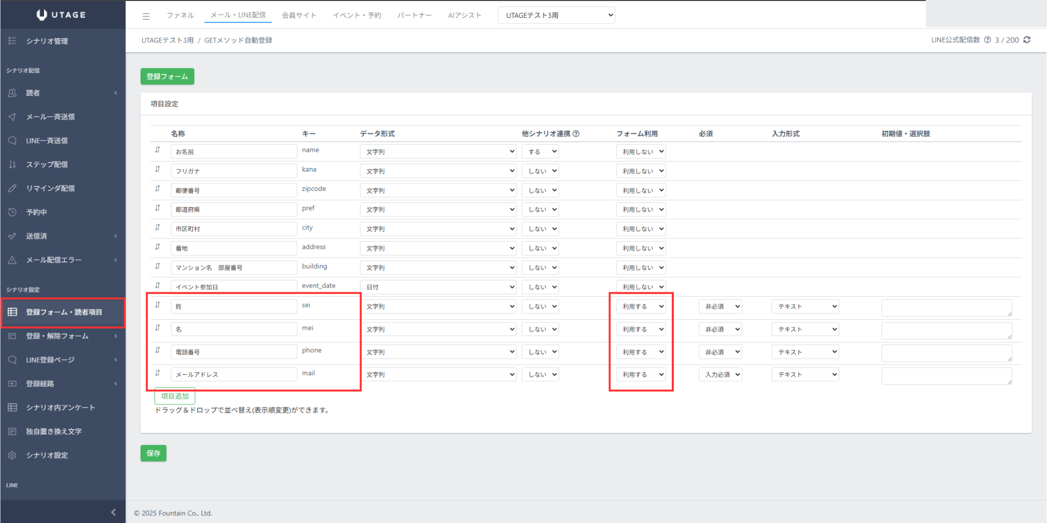 外部システムから連携させたい読者項目の【フォーム利用】を「利用する」にします。