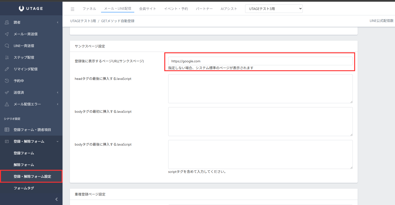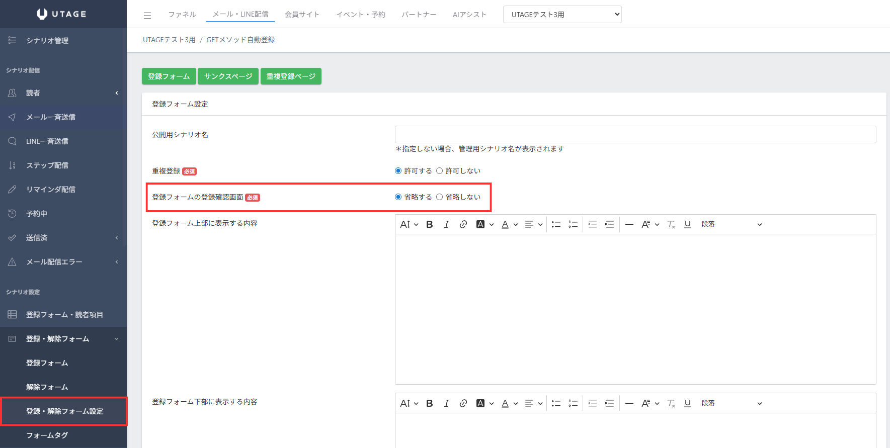 UTAGEシナリオ登録フォームURL(メールアドレス登録フォーム)に対して