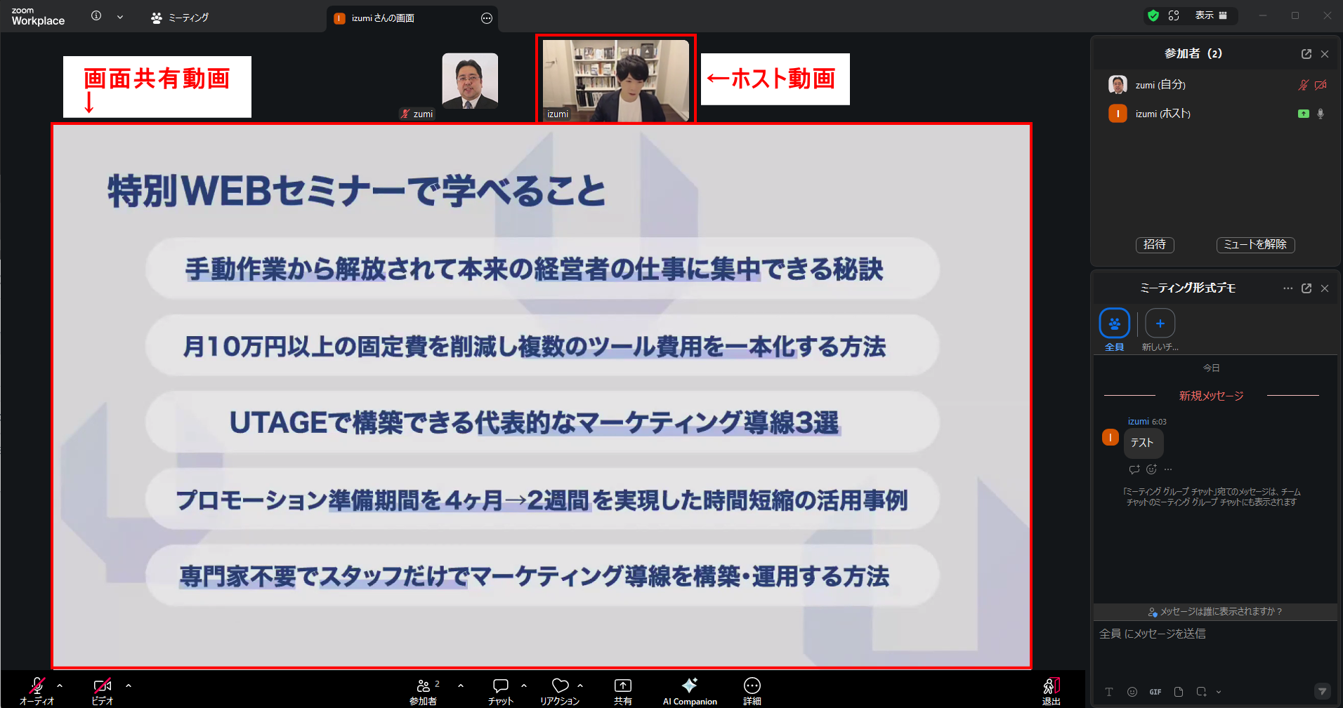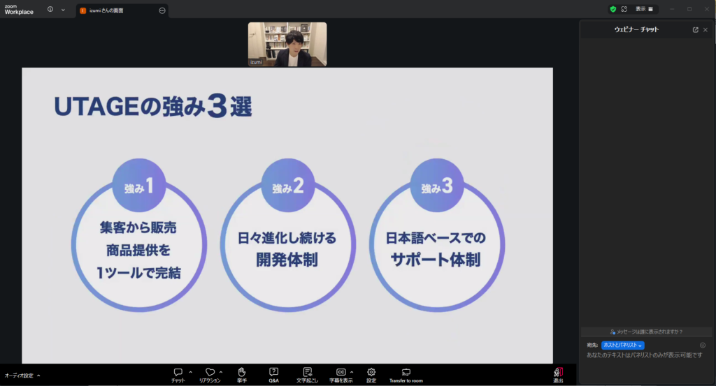 ウェビナーモードではホスト側の映像・音声・画面共有が可能です。