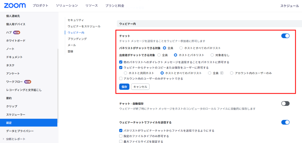 2.「チャット」設定の「出席者がチャットできる対象」を確認し、開催するZoomウェビナーの導線に応じて適宜ご設定ください。