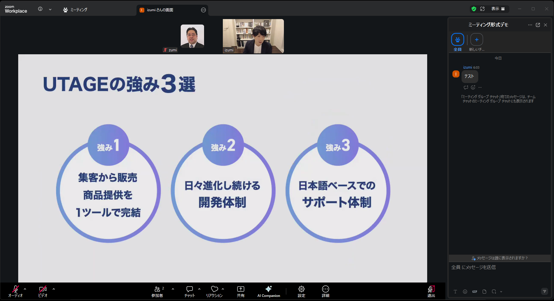 ミーティングモードでは、従来のZoomミーティングと同様に