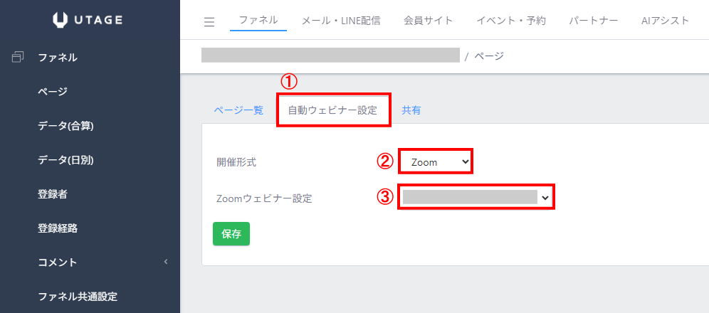 1.ファネル > ファネル名選択 >「自動ウェビナー設定」タブを選択します。