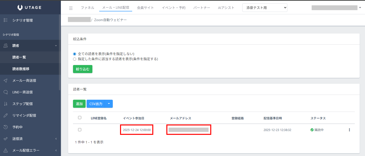 2.読者項目「イベント参加日」「メールアドレス」、その他設定した読者項目にデータが格納されていることを確認します。