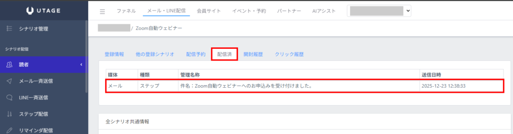 4.「配信済」タブを選択して、テスト登録した読者へのメール配信履歴を確認します。