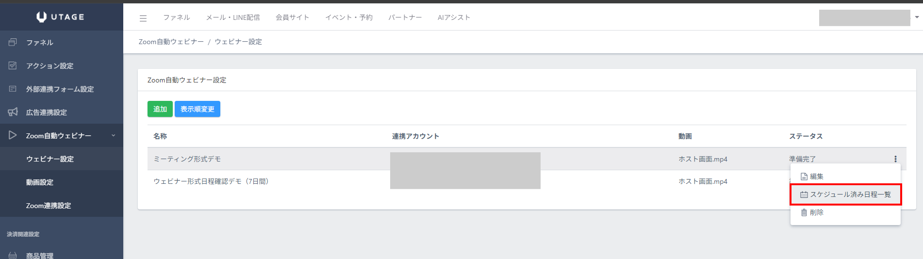 2.動作テストしたいウェビナー設定右側の三点アイコンから「スケジュール済み日程一覧」をクリックします。