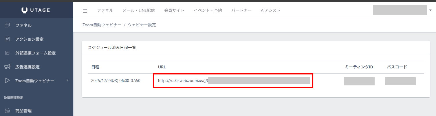 1.ファネル > Zoom自動ウェビナー > ウェビナー設定 にアクセスします。