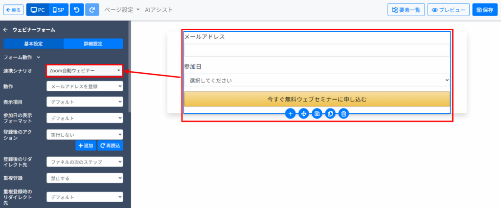 3.【自動ウェビナー】登録フォーム要素を選択し、連携シナリオを選択します。