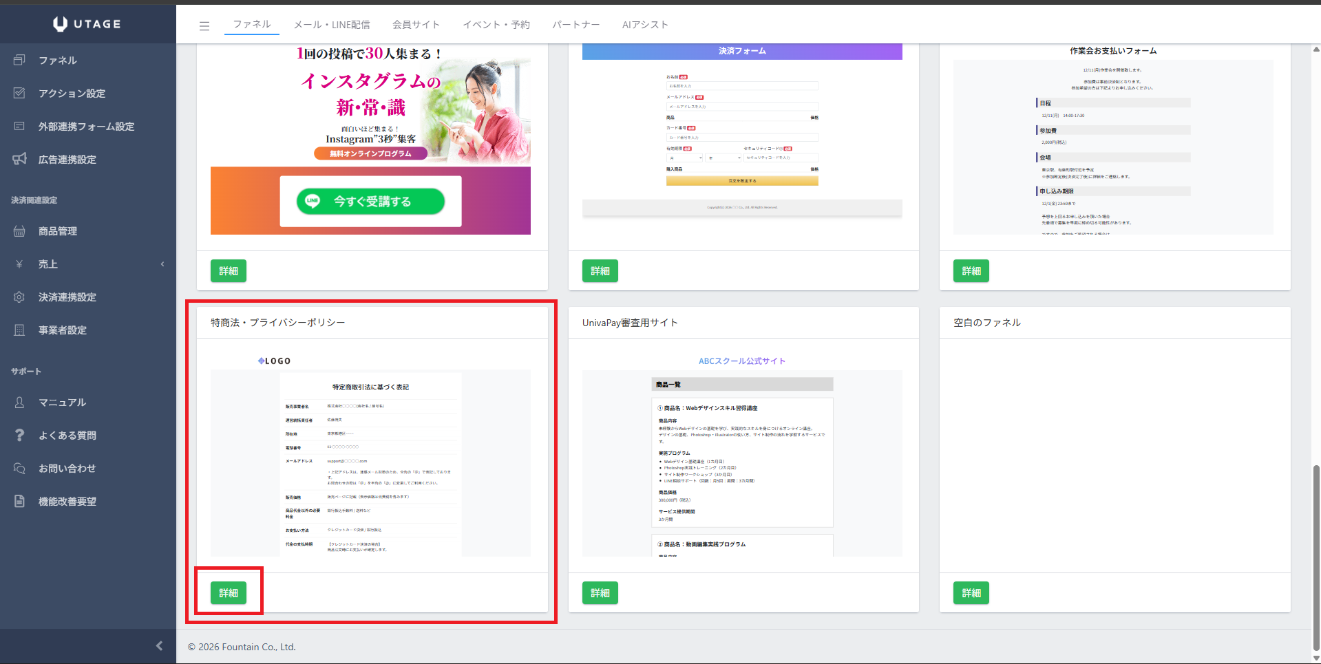 特定商取引法に基づく表記は、ファネル機能で作成可能です。