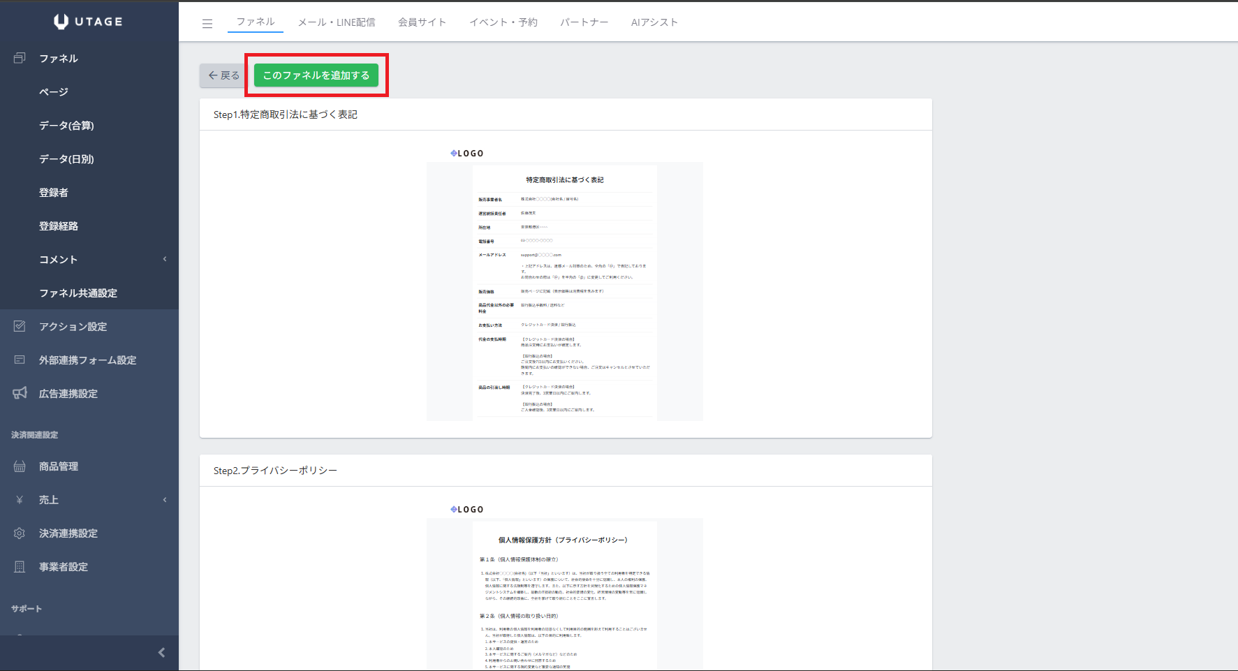 ファネル > 「+追加」から「特商法・プライバシーポリシー」の