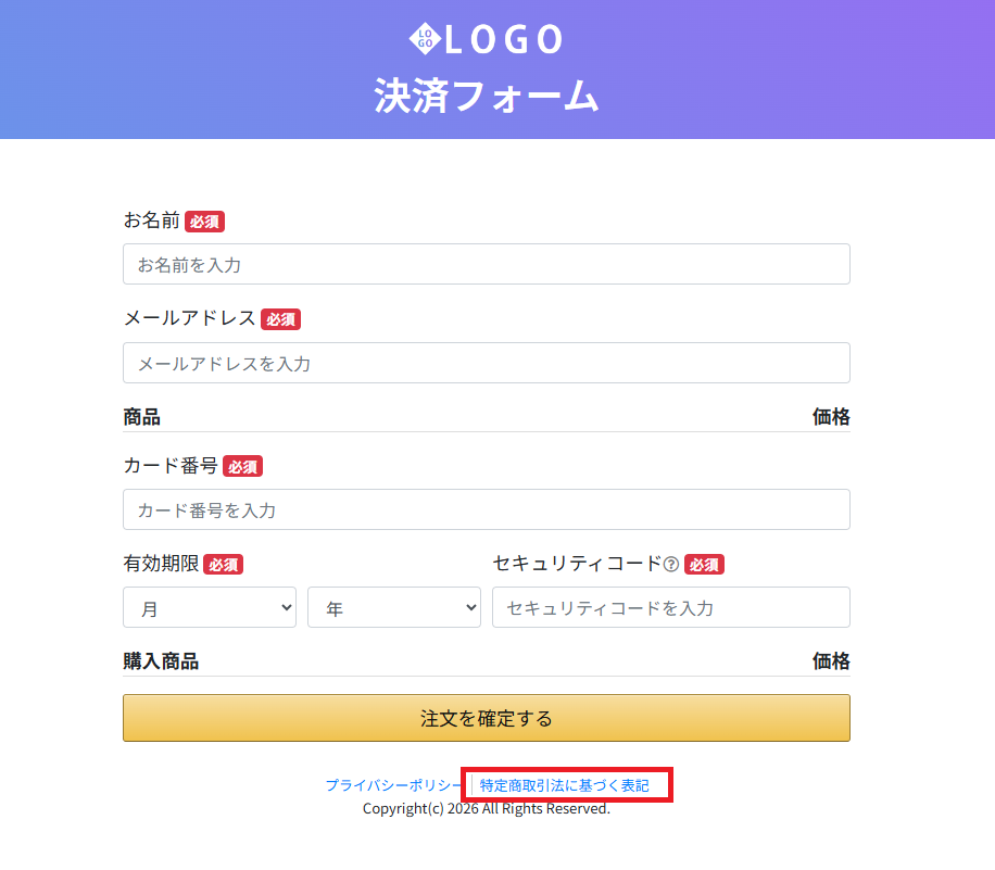 ▼決済ページのフッターに特定商取引法に基づく表記を掲載