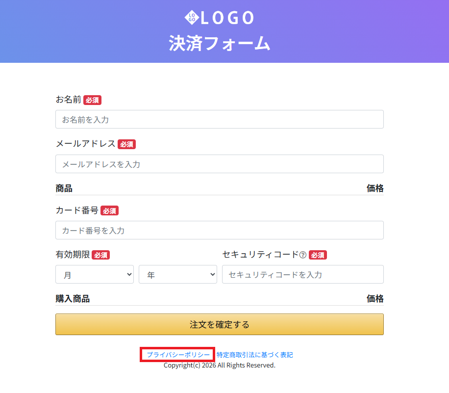 ▼決済ページのフッターにプライバシーポリシーを掲載