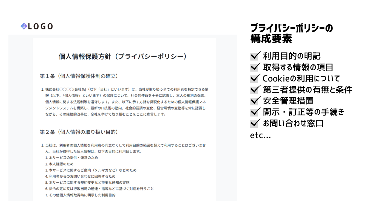 実際の運用では、取得したお客様の情報を「何のために使うのか(メルマガ配信など)」「どのように安全に管理するのか」「第三者に提供することはあるか」といった取り扱い方針を明文化した「専用のページ」を一つ作成します。