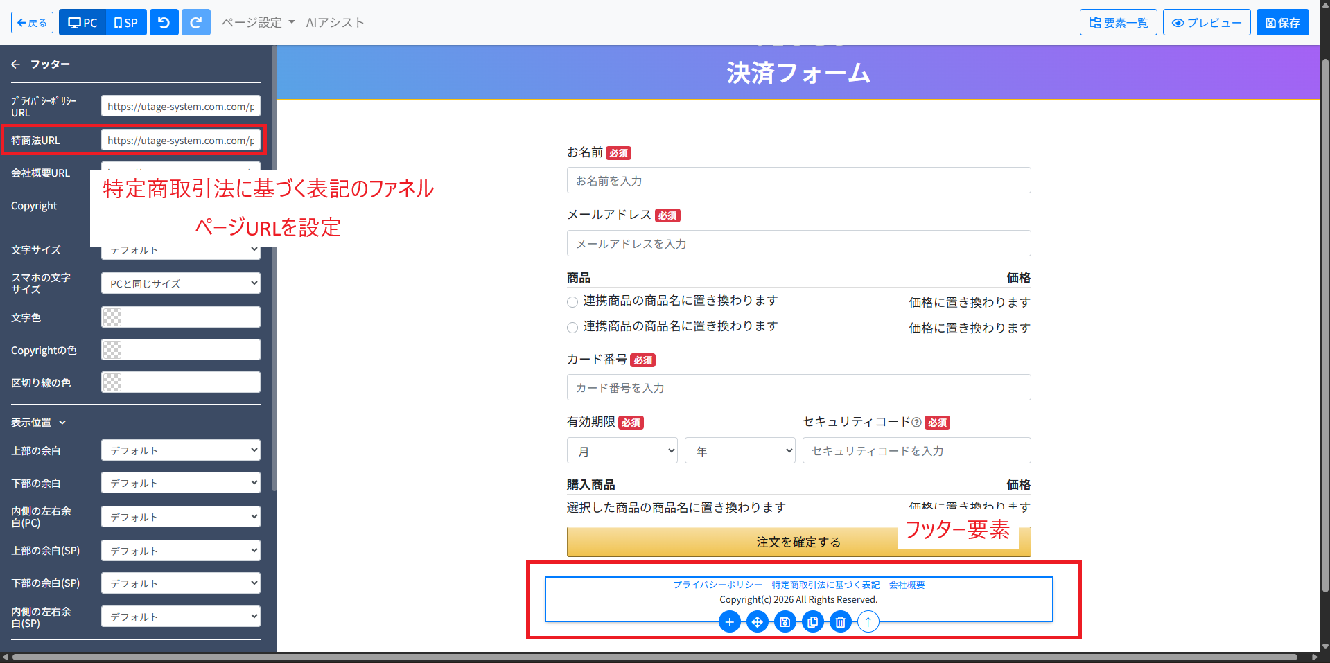 左メニューの「特商法URL」に設定することでリンクの設置が完了します。