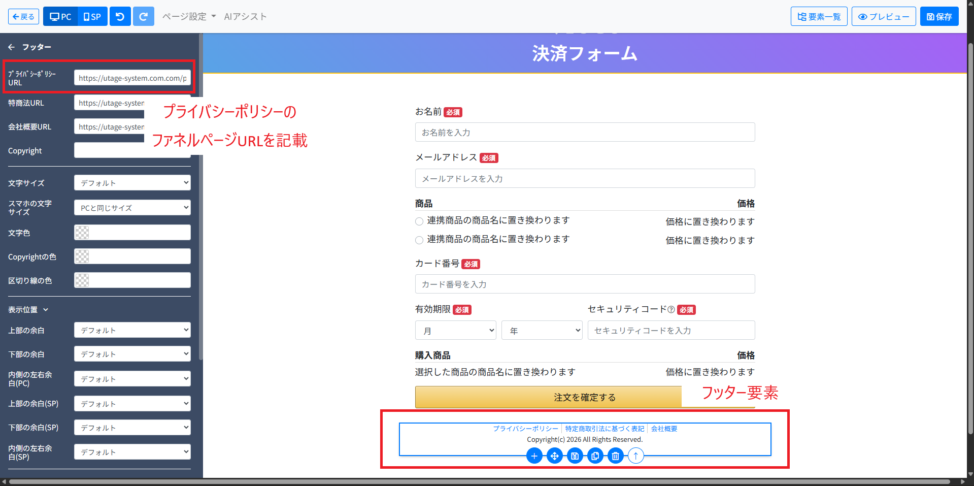 そして、作成したページのURLを、メールアドレスの登録フォームや決済フォームがあるページの最下部(フッター)にリンクとして設置し、お客様が情報を入力する前に確認できる状態にする必要があります。