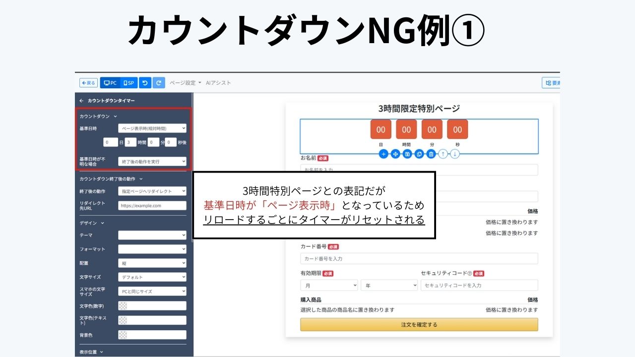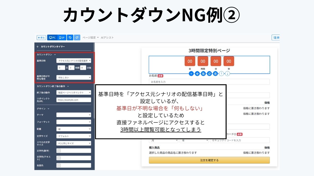 「カウントダウン終了後の動作」や「基準日時が不明な場合」を活用し、本当に販売終了ページへ飛ばすのが安全な運用です。