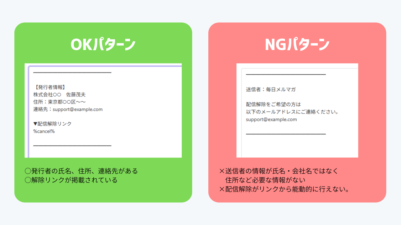 他にも「解除希望の方は返信してください」という手動対応は、原則としてNGです。