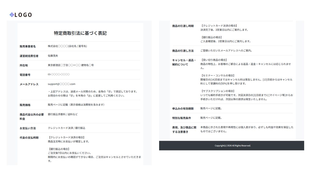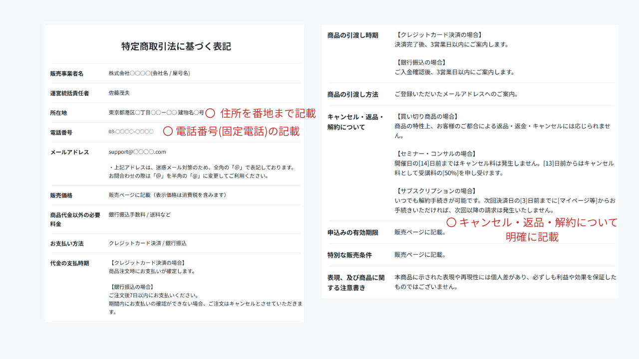 実際の運用では、販売者の氏名(法人名)、住所、電話番号、販売価格、支払時期、返品・返金条件などの必須項目を一覧にした「専用のページ」を一つ作成します。