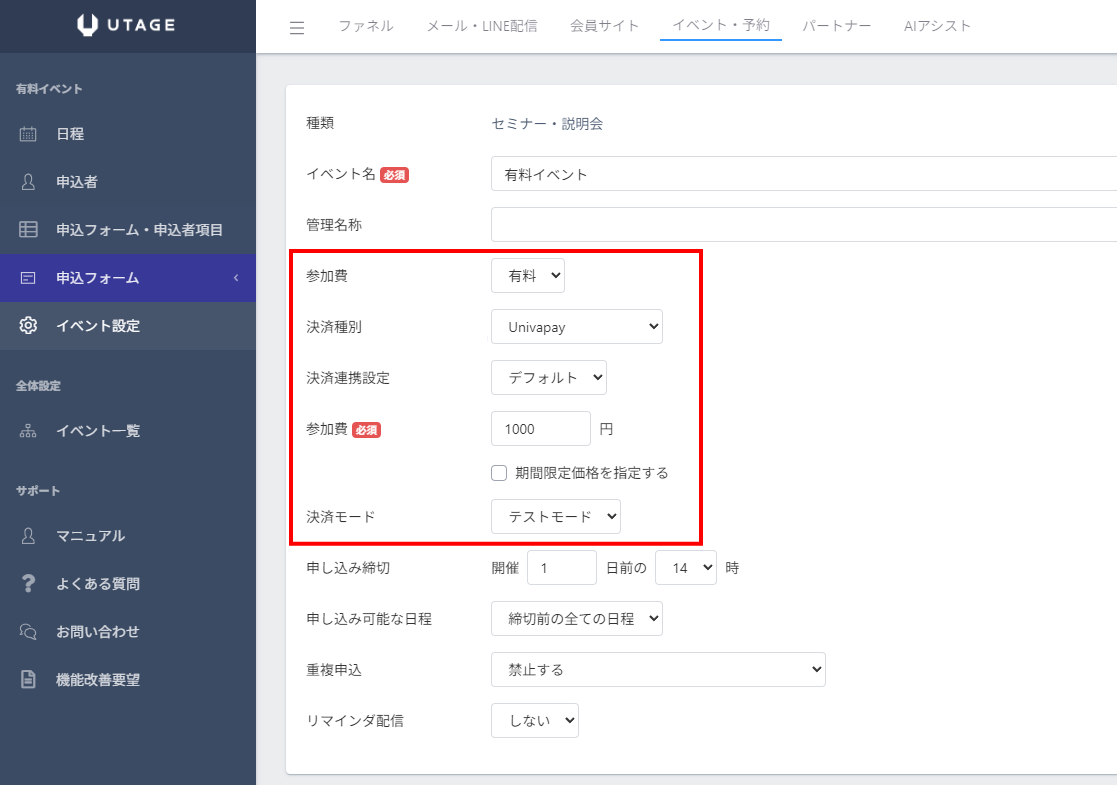 該当イベントの「イベント設定」に下記設定を行うだけで決済が可能です。