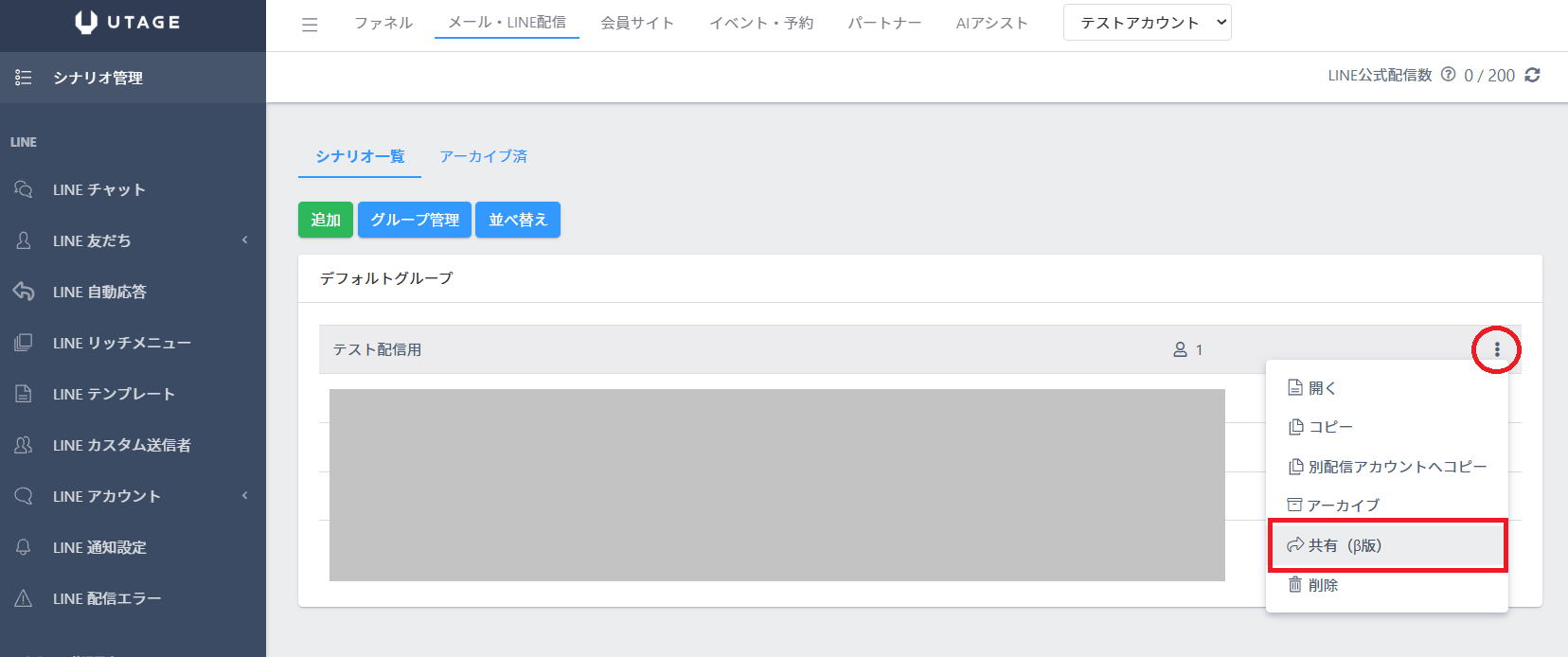 1.メール・LINE配信 > アカウント > 共有したいシナリオの【︙】マークより『共有(β版)』をクリック