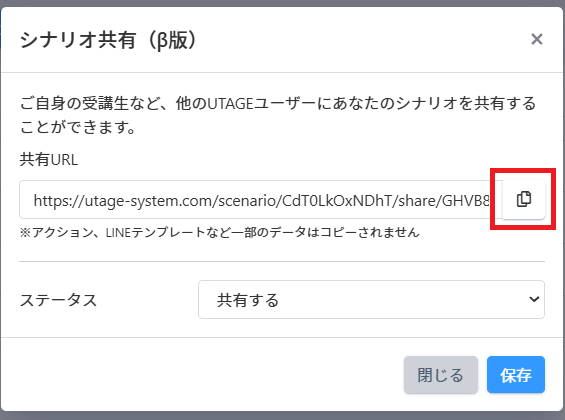 3.コピーボタンから『共有URL』をコピーして他UTAGEユーザーへ共有してください。