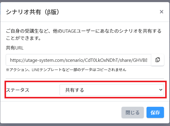 2.シナリオ共有のポップアップにて、ステータス『共有する』へ変更して「保存」