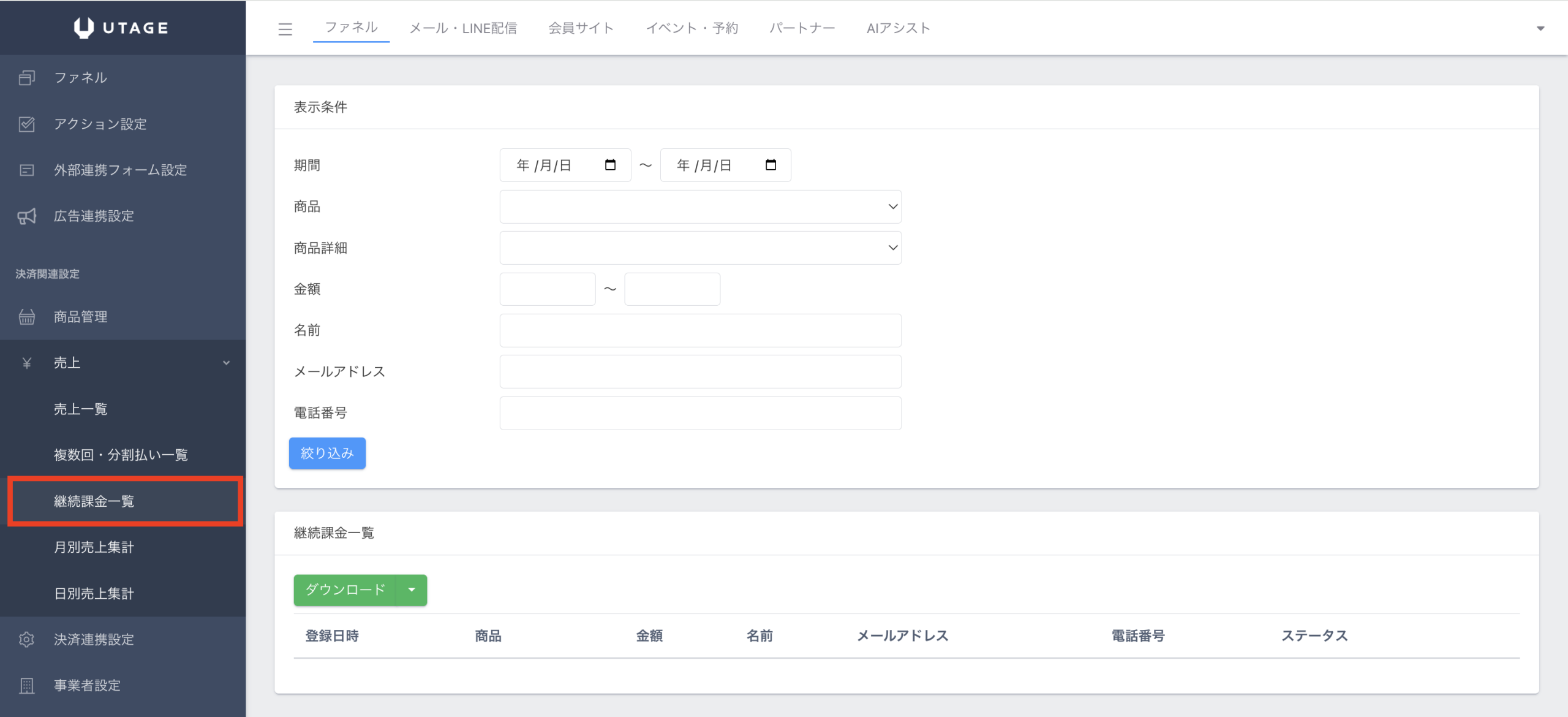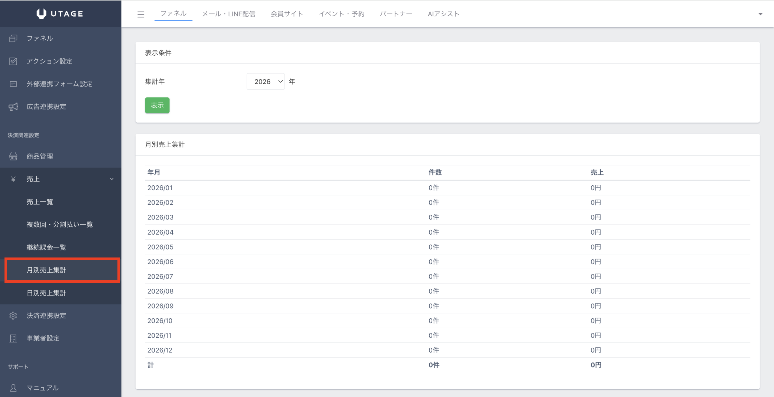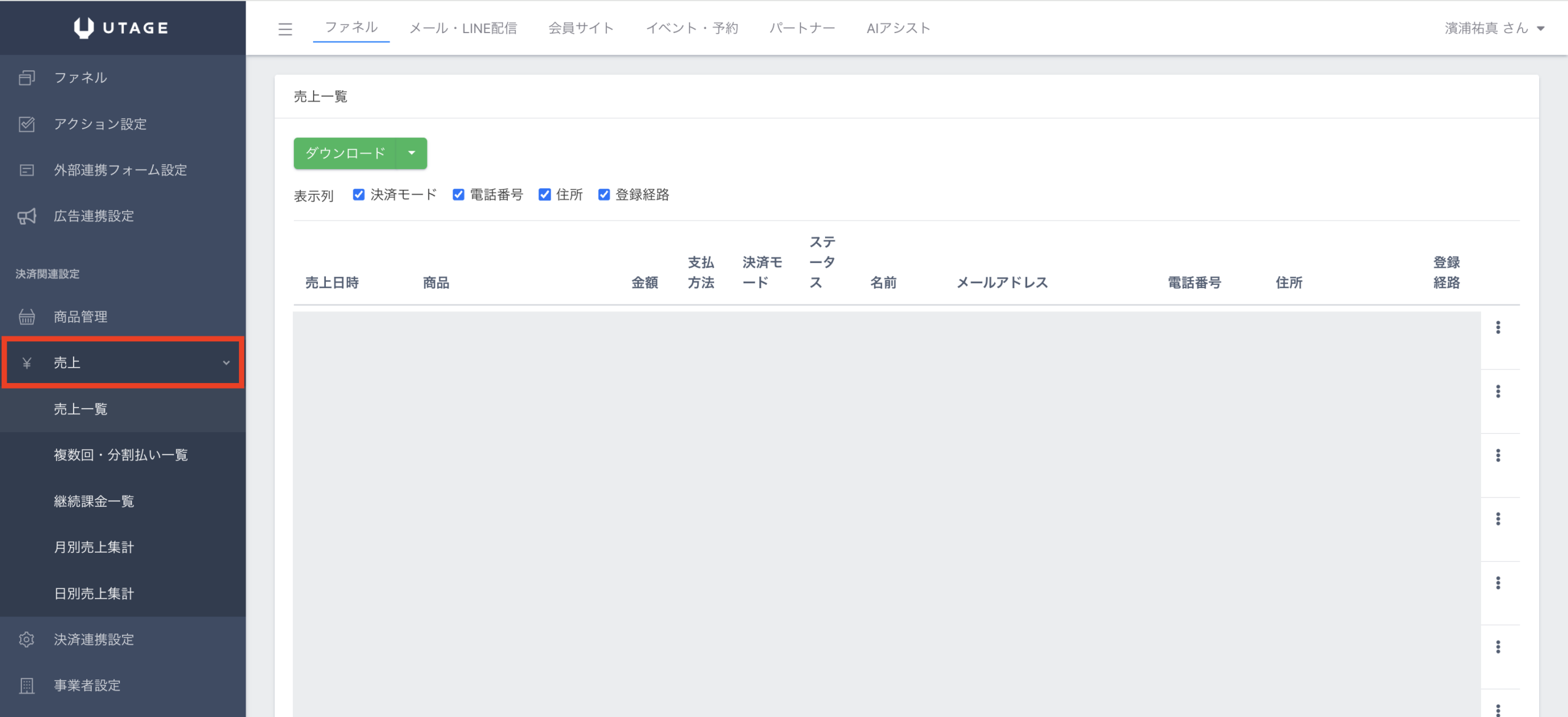 売上では、ファネル機能経由で購入された商品の売上情報を確認できます。