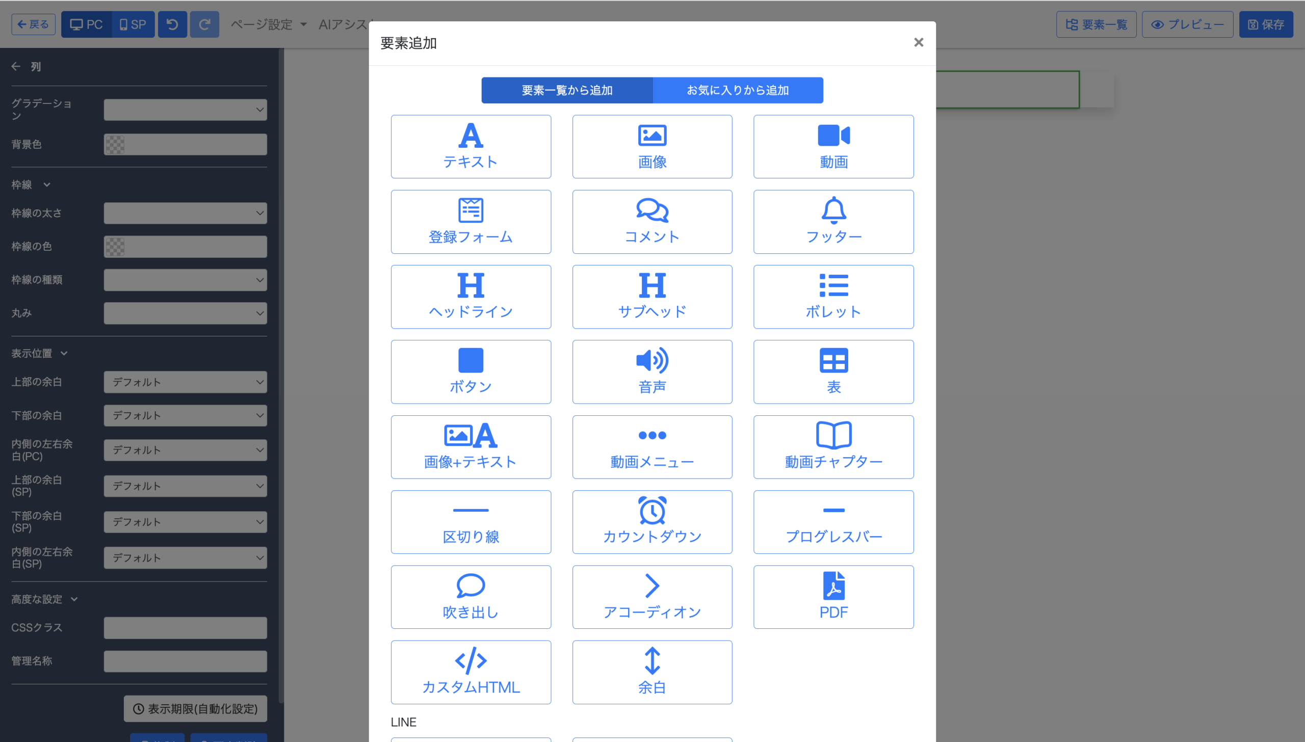 テキスト、画像、動画、ボタン、カウントダウンタイマーなどを自由に配置して編集できます。