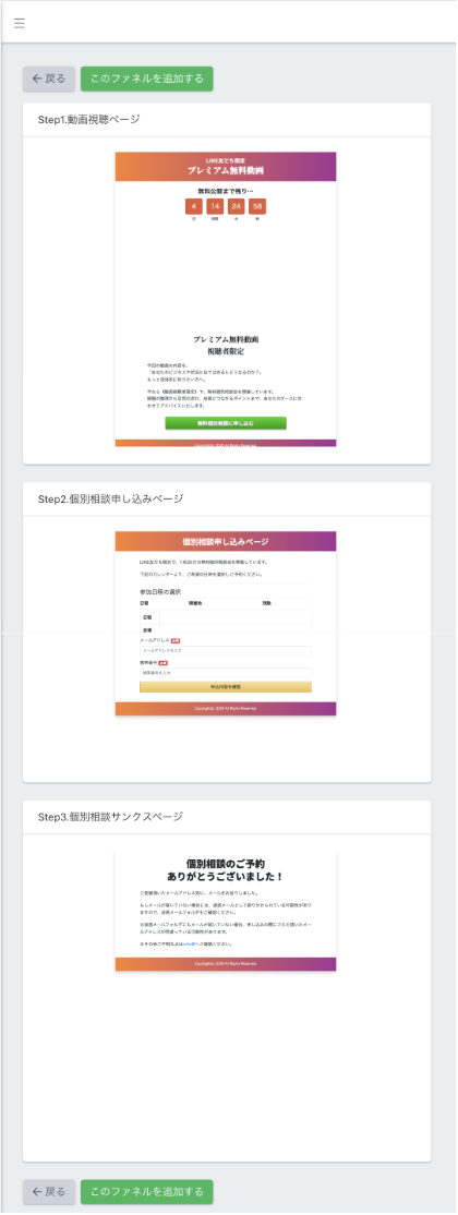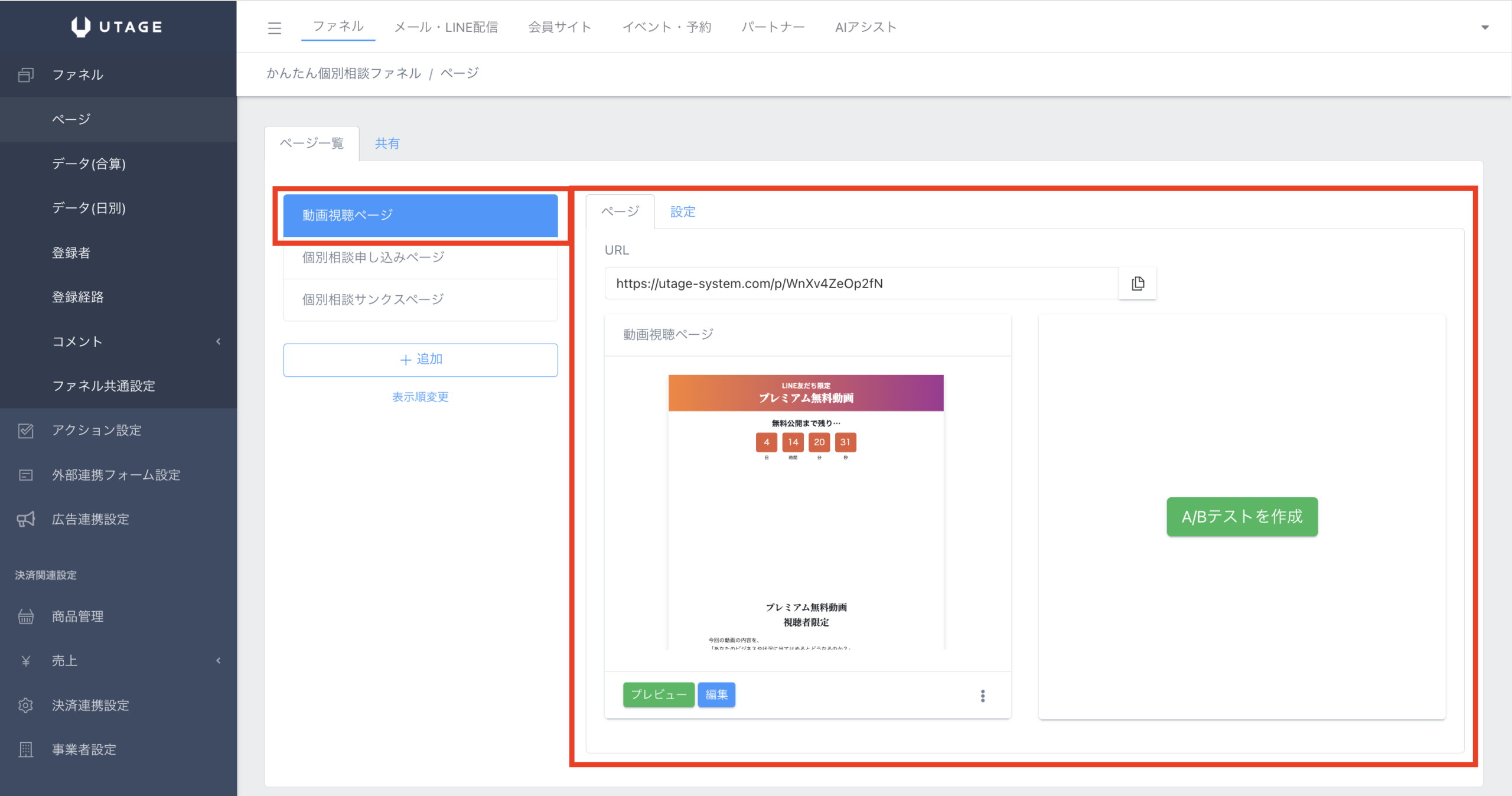 実際にユーザーに公開される「ファネルページ」が作成され、
