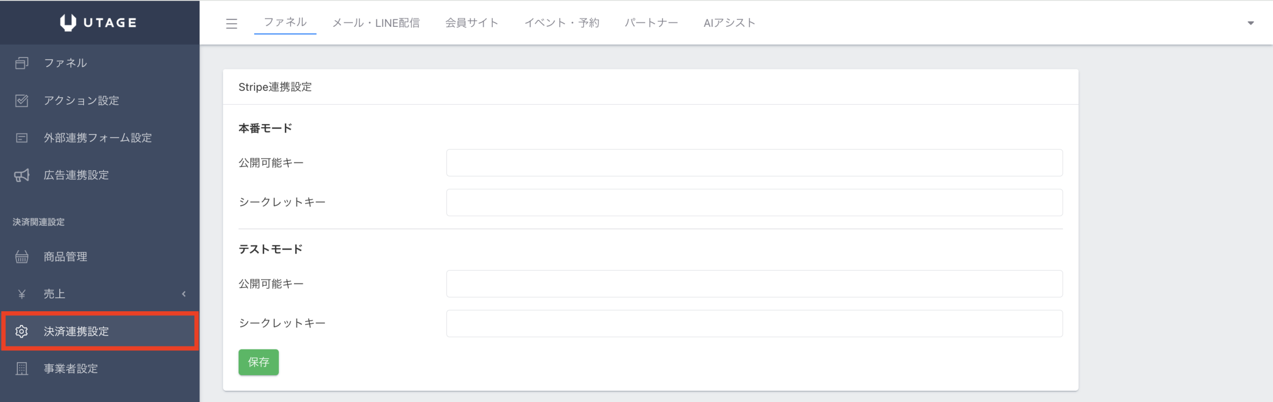 決済連携設定とは、商品販売時に利用する決済代行会社のアカウントをUTAGEに連携する機能です。
