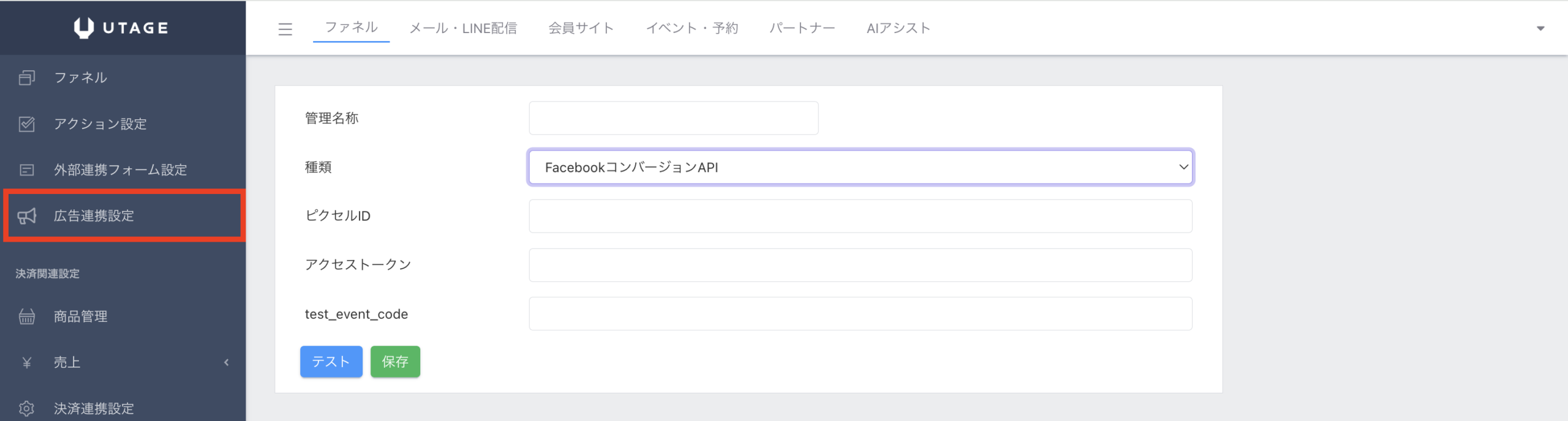 広告連携設定とは、Facebook広告(Meta広告)とUTAGEを連携させるための機能です。