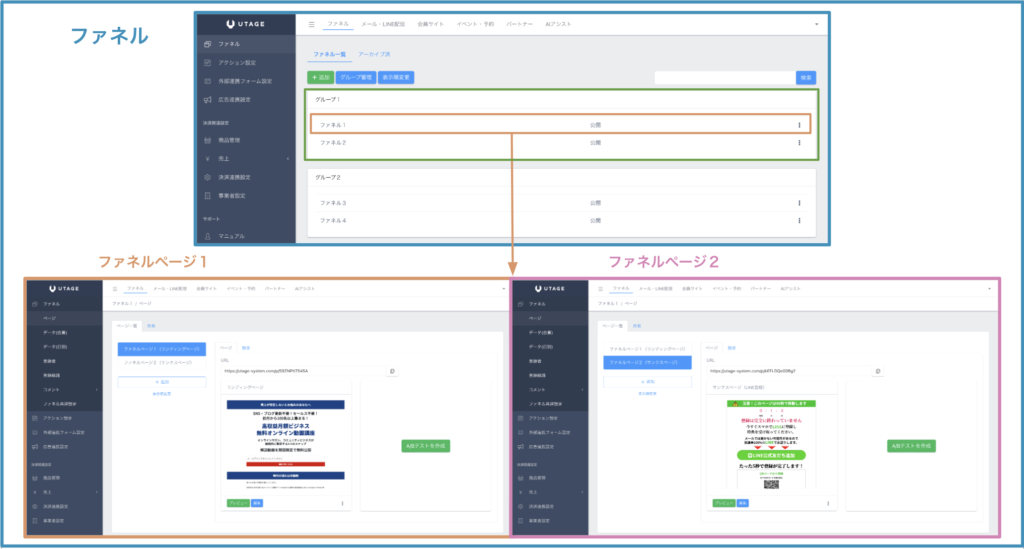 オプトインページ(メールアドレス登録/LINE登録)や販売ページの作成・編集ができるほか、