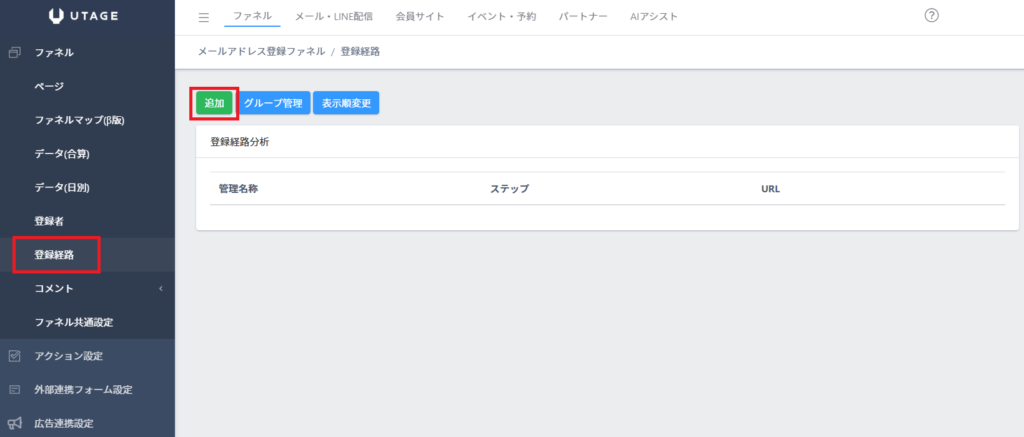 - 登録経路機能:UTAGEの標準機能として、ファネル・メール・LINEそれぞれに登録経路を設定できます。LPを複製する必要がなく、1つのLPで複数の流入元を計測できるため、最も手軽でおすすめの方法です。