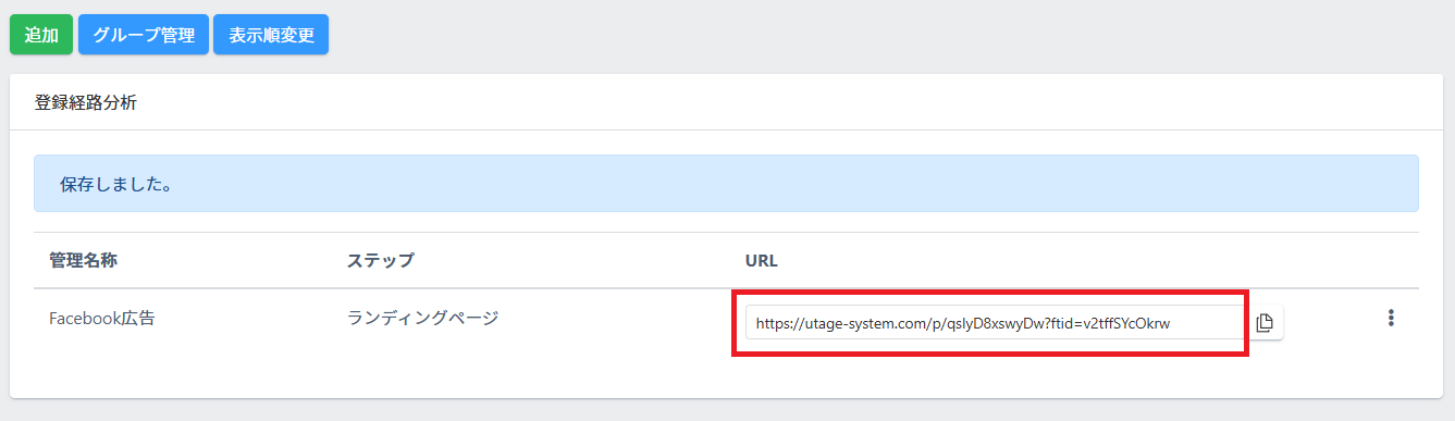 ファネルの登録経路機能を使えば、1つのランディングページ(LP)に対して、Facebook広告用・YouTube広告用・ハウスリスト用など、流入元ごとの専用URLを発行できます。それぞれのURLからのアクセス数・登録数・売上を個別に計測できます。