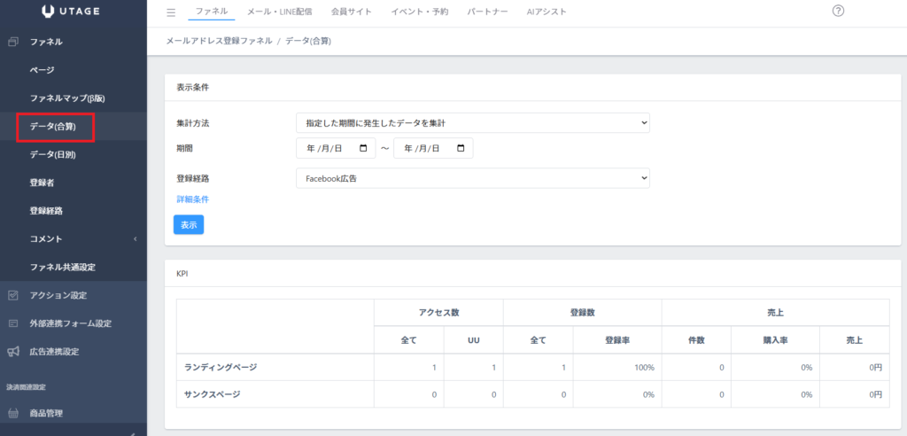 - 【KPI】欄に、アクセス数(PV・UU)・登録数・登録率・売上件数・売上金額が表示されます。